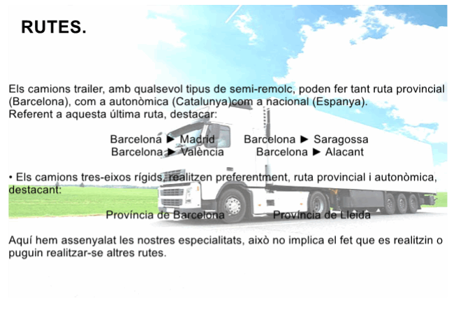 1. Camió trailer amb semi-remolc de lateral baix o plataforma amb mesures interiors lliures de 13,60 mts. de llarg i 2,55 mts. d'ample, amb una capacitat de càrrega útil de 26 Tn.